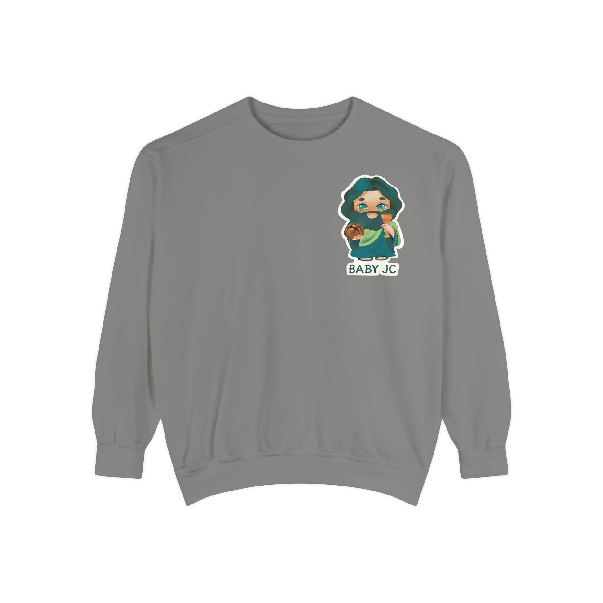 Stay cozy while carrying a beautiful message of faith with our Little Supper with Baby JC Adult Sweatshirt. Featuring the heartwarming design of Baby JC holding bread 🍞 and a cup of wine 🍷, this piece symbolizes love, grace, and the joy of sharing blessings together. Perfect for Sunday service ⛪, Bible study 📖, family gatherings 🏡, or simply relaxing at home, it’s a stylish way to keep your heart and spirit warm.